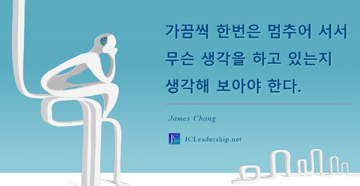 내가 원하는 꿈과 미래를 만들어 가려면, 그리고 내가 가진 행복 추구권과 결정권을 온전히 내 것으로 활용하려면 주기적인 멈춤의 시간은 필수입니다. 물론 멈춤의 시간을 통해서 많은 것들을 생각하고 진단하게 될 것이지만 자신의 생각 또한 진단해 보아야 합니다. “나는 무슨 생각을 하고 있는가?”를 생각해 보는, 내면을 들여다보는 바로 그런 진단의 시간이 필요하다는 것입니다. 생각이 바껴야 운명이 바뀐다고 합니다. 그렇다면 무슨 생각을 하고 있는지에 대한 주기적 진단이 필수인 것은 그리 어려운 개념은 아닐 것입니다. 그래서 무슨 생각을 하고 있는지 생각해 보는 시간은 필수일 것입니다.