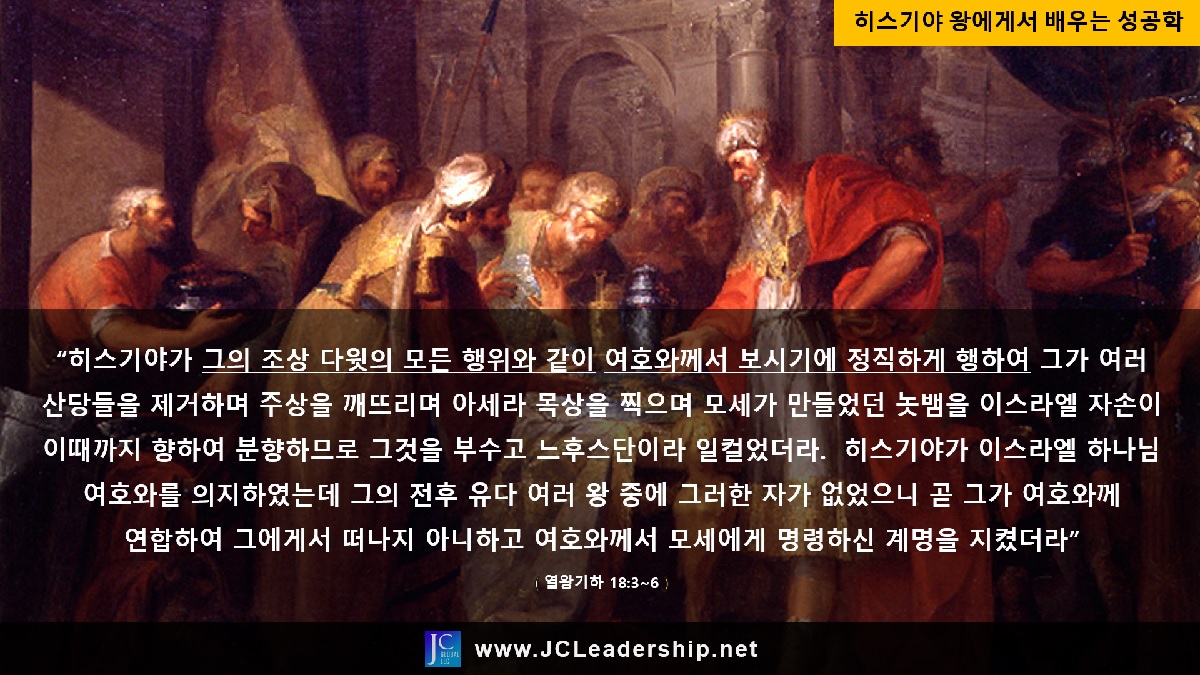 가장 사악한 왕이라는 아버지 밑에서 자란 히스기야는 이러한 다섯가지 요소를 가지고 전후에도 없었던 왕이라는 극찬을 듣는 왕으로 성공을 거두게 됩니다. 그로 인해 백성은 평화롭게 되고, 외세의 침략은 막아지고, 국가는 다시 강건함을 되찾게 되었습니다.
