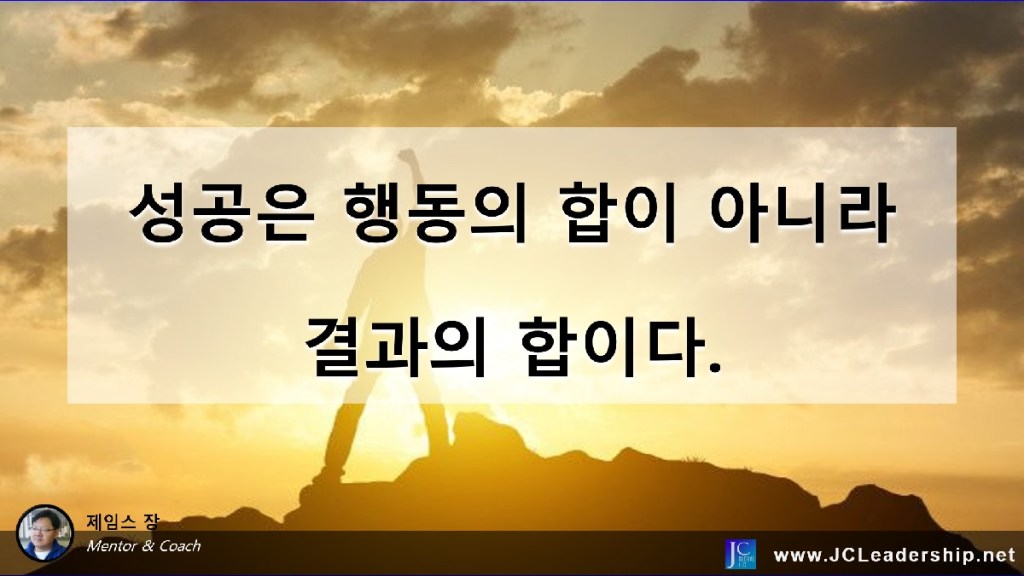 성공은 행동의 합이 아니라 결과의 합이라는 것을 기억하십시오. 수많은 사람들이 엄청난 행동을 하고 살아 갑니다. 정말 바쁘고, 정신없이, 열심히, 미친듯이 살아가고 있습니다. 만약 행동이 성공의 조건이었다면 그들은 모두 성공했어야 합니다. 행동이 결과를 만들고, 그 결과가 모여 성공이 이루어진다는 순서가 존재합니다. 그렇다면 행동을 위한 행동이 아니라 결과를 위한 행동이 되어져야 하고 그것이 측정되어져야 하는 것입니다.