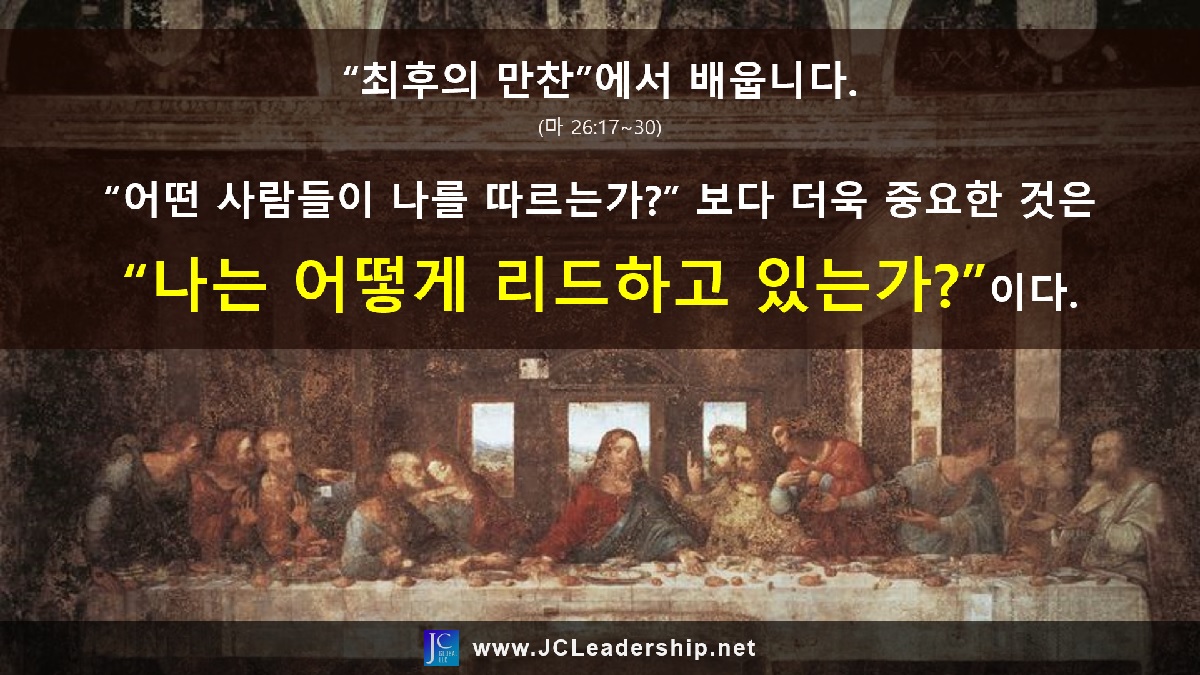 예수님의 그 모습은 아마도 제자들에게는 엄청난 배움의 시간을 제공하였을 것입니다. 자신들의 모습을 보고도 평가하지 않으시고 가능성을 보아주신 예수님, 만찬이 끝나면 십자가를 향해 한발 더 나아가야 하는 어처구니없는 상황이지만 그 상황과 상관없이 감사의 솔선수범을 보여주시는 예수님, 그럼에도 주어진 사명에 집중하시는 예수님, 함께 하겠다는 약속을 통해 혼자가 아니라는 확신을 심어 주시며 소속감을 증폭시키고 용기를 주시는 모습을 보여주셨습니다. 예수님의 그 리더로서의 모습은 만찬에 함께 했던 예수님의 제자들이 앞으로 보여주어야 하는 모습이며 미래의 크리스천 리더들이 보여주어야 하는 리더십의 한 부분일 것입니다.