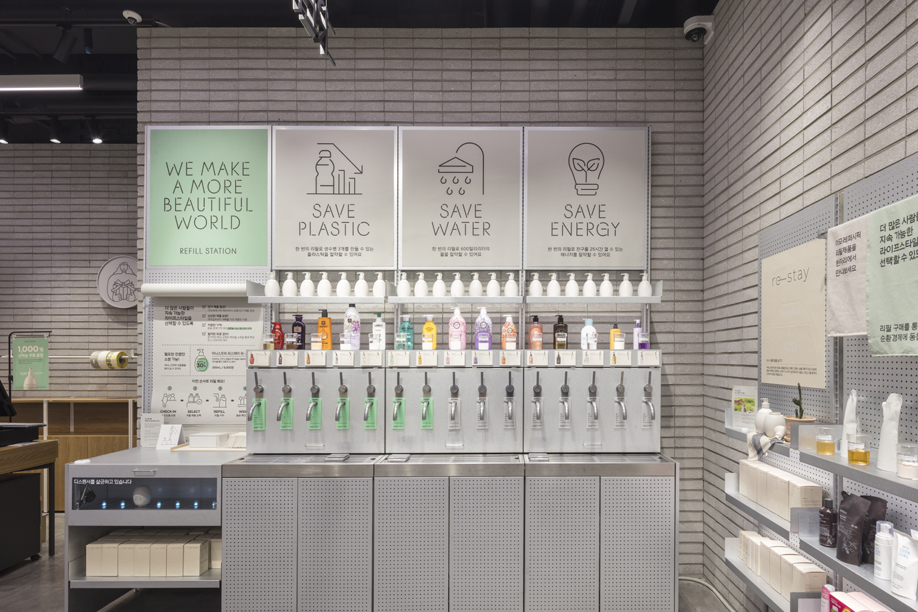 위의 사진들은 아모레 퍼시픽에서 새롭게 선보이기 시작한 리필 스테이션의 장면입니다. (보도자료 참조) 플라스틱 줄이기, 자연 보호, 가격 경쟁 등의 관점에서도 이미 그 니즈는 존재하였었지만 온라인 시장의 확산으로 매출과 기업 이미지 전달하기 등에서 어려움을 겪기 시작한 기업들이 그들의 활로를 열어 가기 위한 소비자 접촉 방법의 변화를 위한 이러저러한 아이디어가 현실화되고 있는 것입니다.