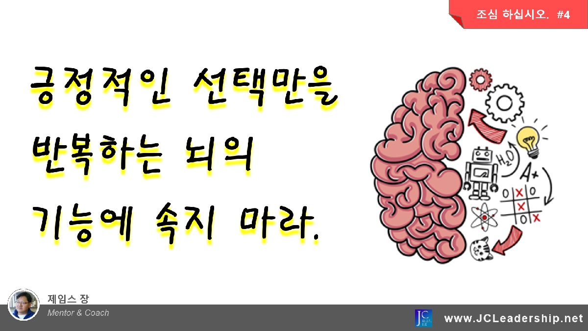 조금 더 쉽고 편한 것을 찾는 뇌의 본능적 기능을 따라가시겠습니까? 아니면 인간의 고유 권한인 의지적 선택을 통해 의미가 있는 하루를 만들어 보시겠습니까? 이 글을 읽은 오늘 하루는 한 가지라도 의지적 선택을 의도적으로 실행함으로 조금 더 변화하고 성장하는 모습이 만들어졌으면 합니다. 그리고 그를 통해 성공이라는 목적지에 조금이라도 더 가까이 가게 되기를 바랍니다.