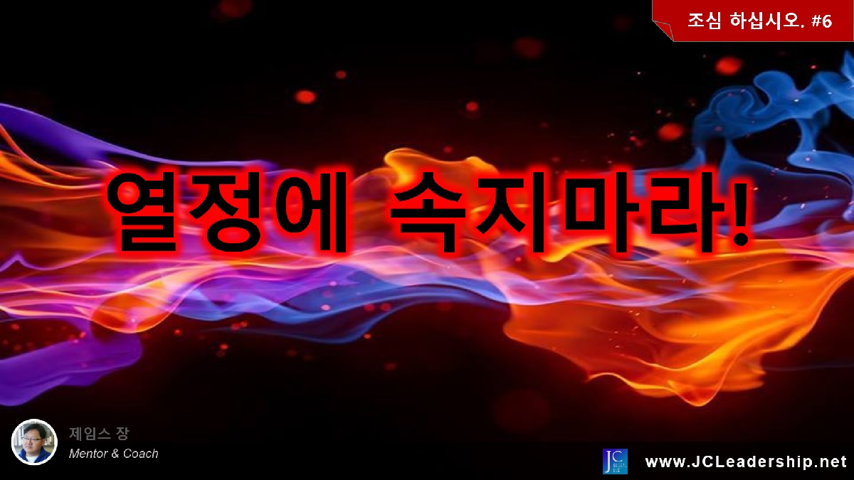 열정에 속지 마십시오. 열정은 비이성적이며 무모하게도 만드는 위험한 감정이기도 합니다. 혹시 성격상 또는 성향상 넘치는 열정을 가지고 계십니까? 가진 열정을 조심하십시오. 열정 때문에 크게 성공할 수도 있고 크게 실패할 수도 있기 때문입니다. 열정은 성공의 필요조건이기는 해도 절대조건도 충분조건도 아닙니다. 열정은 그저 인간이 가진 감정의 하나로서 성공을 위해 잘 관리하여 사용해야 하는 하나의 툴인 것을 기억하십시오.