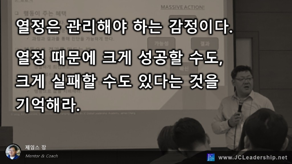 열정은 감정이기에 용기를 주어 새로운 일에 도전하는 시작점의 힘을 제공하고, 결단과 인내의 힘을 제공하는 등의 긍정적인 요소도 있지만 만약 컨트롤 되지 않는다면 무모함에 불을 붙이는 부정적인 요소로 작용하기도 합니다. 허풍에 부채질을 하여 근거 없는 자신감으로 만들기도 하고, 탐욕을 포장하고 정당화시켜 잘못된 행위를 서슴치 않는 잘못된 용기를 만들어 내기도 합니다. 넘치는 열정에 작은 것들을 무시하게 되어 모래성을 쌓기도 하고, 구성원들에게 상처를 주기도 합니다. 뜨거운 열정 때문에 멈추어야 할 때 멈추지 못하고 낭패를 당하기도 합니다. 한마디로 열정이라는 감정의 힘이 떠밀려 잘못된 결단을 하기도 하고 잘못된 행동을 합리화하고 강화하는 경우가 발생하여 실패의 길을 가게도 된다는 것입니다.