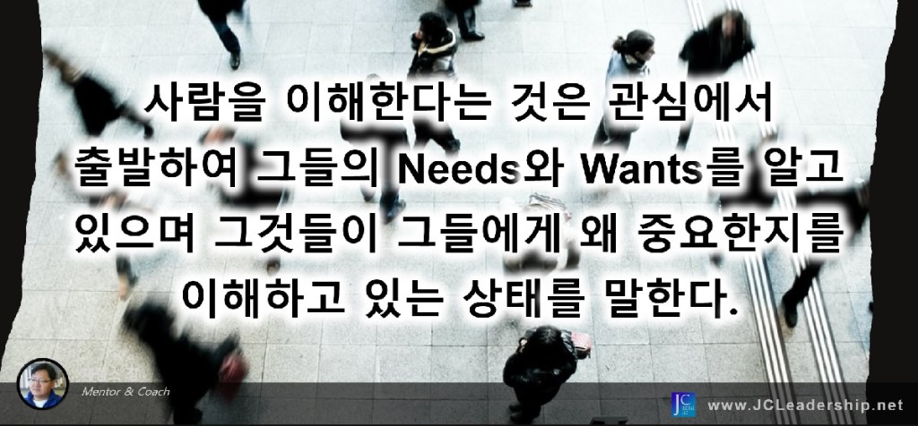 한마디로 사람에게 관심을 가진 다는 것일 것입니다. 그의 Needs와 Wants에 관심을 가지고 있고 그것을 이해하고 있는 상태가 바로 사람을 이해하고 있는 것일 겁니다. 그들의 Needs와 Wants를 알면 그들이 추구하는 행복과 만족의 기준, 생각과 판단의 기준을 알 수 있기 때문입니다. 가족을 사랑한다면 그것은 그들의 Needs와 Wants를 알고 있어야 하고, 그것들이 왜 가족 구성원들에게 중요한지를 이해하고 있어야 합니다. 그렇게 관심에서 출발하여 그들의 Needs와 Wants를 알고 있으며 그것들이 그들에게 왜 중요한지를 이해하고 있는 상태가 바로 사람을 이해하고 있는 것입니다.