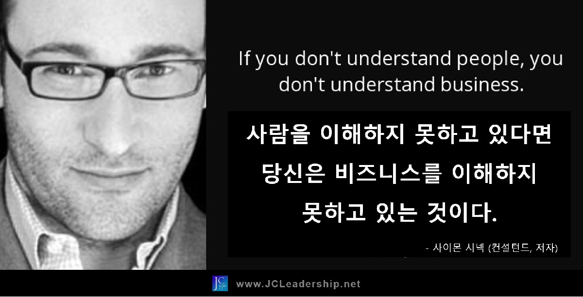 사이먼 시넥이 주는 여러 메시지 중에서 특히 기업을 하는 분들, 공동체의 리더들, 한 가정의 가장 등과 같이 리더의 위치에 있는 분들이 간과하지 말아야 할 메시지는 바로 “사람을 이해하지 못하고 있다면 비즈니스를 이해하지 못하고 있다는 것이다!”라는 말입니다. 즉 사람을 이해하지 못했다면 해야 하고, 이루어야 할 일을 이해했다고 볼 수 없다는 것입니다. 이유는 너무도 단순합니다. 그의 말처럼 직원의 100%가, 고객의 100%가, 구성원의 100%가 사람이기 때문입니다. 너무도 단순한 이유이고 단순하게 표현된 문장이지만 진정으로 핵심을 찌르는 개념입니다. 아마도 많은 리더들이 생각하고 말하고는 것이지만 가장 자주 잊게 되는 것이기도 할 것입니다.