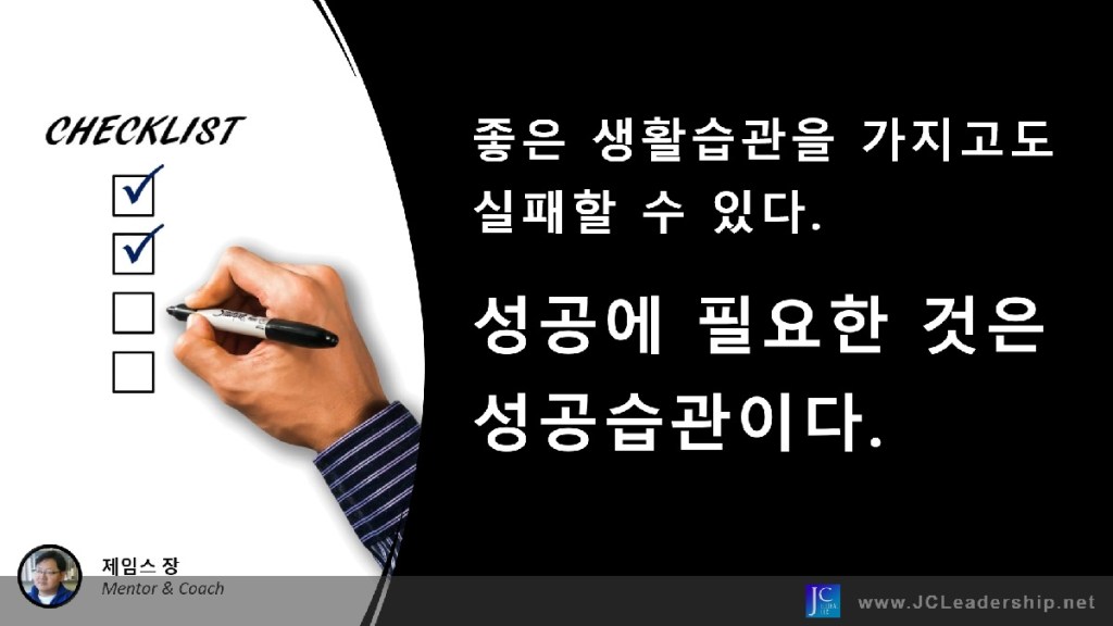 성공을 원하는 사람은 생활습관과 성공습관은 분명 다르다는 알아야 합니다. 이 두가지가 정확히 구분이 되지 않는 긍정적인 사람은 좋은 습관을 가지고도 결과가 없는, 또는 실패한 삶을 살아갈 수 있습니다. 세월이 지나 “내 인생이 왜 이렇게 되었지?”라는 질문을 스스로에게 하는 안타까운 현실을 접하게 될 수 있다는 것입니다. 즉 자신에게 다가온 나쁜 결과에 대해 좋게 받아들이고 자신의 감정 컨트롤을 잘 하여 아주 긍정적이며 즐거운 하루를 보내는 좋은 생활습관을 가질 수는 있지만 그것을 승화시켜 성공으로 연결시키는 성공습관을 가지지 못하면 성공의 기회는 가질 수 없다는 것입니다. 아마도 주변에서 자신은 즐겁게 살지만 주변 사람들에게는 자신의 존재가치를 인정받지 못하는 사람들을 보신 적이 분명 있을 것입니다. 바로 그런 분들이 긍정적으로 산다는 좋은 생활습관은 가지고 있지만 성공으로 연결하는 성공습관은 가지지 못한 분들입니다.