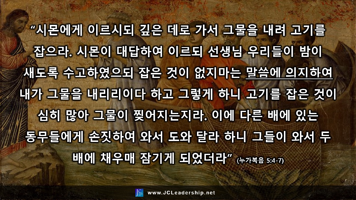어부로서 이미 훈련된 고기잡이 전문가이고, 어부로서 기적을 보면 기적이라고 알아볼 수 있는 충분한 경험과 안목을 가진 그는 무엇을 의지해야 하는지도 아는 사람이었습니다. 실력과 경험, 안목을 가진 그에게 깊은 데로 가서 그물을 던지라는 예수님의 말씀을 하셨고 그는 “말씀에 의지하여”라는 마음의 고백을 합니다. 그것은 바로 예수님의 정체성을 인지한 믿음의 고백인 것입니다. 그는 밤새 고생을 했지만 고기잡이에 실패한 실력가 어부로서의 경험을 이야기하며 된다 안된다는 논하지 않습니다. 자신의 전문성과 경험이 논쟁의 이유가 되거나 판단의 근거가 되지 않았습니다. 그저 예수님이 말씀하시니 그 “말씀에 의지하여” 다시 해보겠다는 그의 마음을 예수님께 고백하는 모습을 우리는 이 장면에서 보게 되는 것입니다.