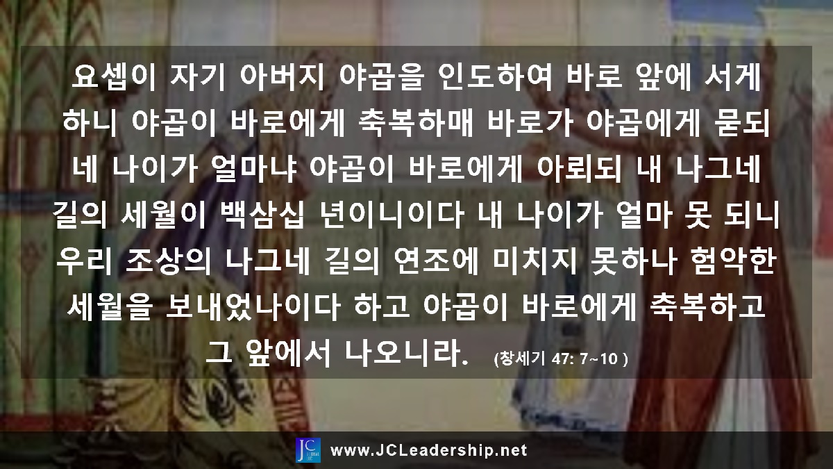 그리스도인이라면 주변에 있는 누구에게든 축복이 되어야 합니다. 저는 그러한 모습을 야곱이 바로를 축복하는 모습(창 47:7~10)에서 봅니다. 당시 애굽은 신정국가로서 왕이 신이요, 신이 왕인 그런 국가였습니다. 한마디로 바로는 “우상 그 자체다”라고도 볼 수 있는 존재입니다. 그런 그를 야곱은 축복합니다.
