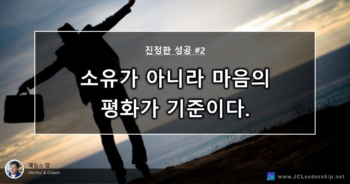 성공에 대해 이야기를 하다 보면 수많은 사람들이 얼마나 가졌는가를 기준으로 성공을 가늠하고 있음을 발견하게 됩니다. 돈, 부동산, 명예, 직위, 학벌 등등의 것들을 기준으로 성공을 측정하는 것입니다. 하지만 저는 앞 글을 통해서 그러한 것들은 성공이 아니라 성취의 영역이라 정의합니다. 그리고 저는 성공의 첫째 기준은 마음의 평화이고 마음의 평화는 건강, 관계, 감성, 경제 등의 것들이 균형 잡힘으로 가능하게 되는 평화로운 내면의 상태를 말합니다. 즉 외면적으로 측정 가능한 소유가 기준이 아니라 마음의 안정된 평화가 성공의 첫번째 기준이라는 것입니다.