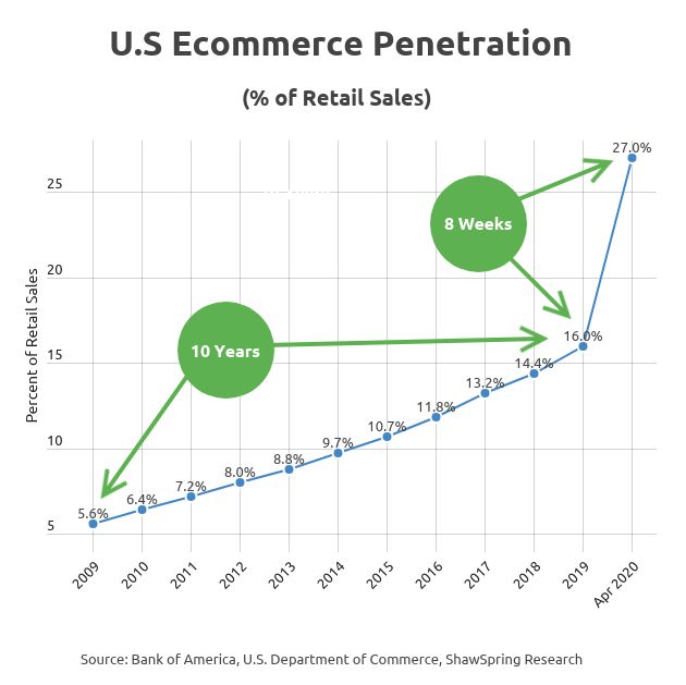 2009년부터 2020년 4월까지의 미국내 Ecommerce의 시장 점유 통계입니다. 10년 동안 5,6%에서 16%, 약 10% 성장을 하였다면 2020년 초 4개월 동안 10% 성장을 하였습니다. 즉 10년이 걸린 성장을 2020년 초 4개월만에 이루어 낸 것입니다. 코로나 사태가 2020년 4월경 시작이라고 볼 때 2020년 말까지의 성장 통계가 집계가 되고나면 그것은 어마마한 상승세일 것이라는 것은 누구나 예측 가능한 것일 겁니다.