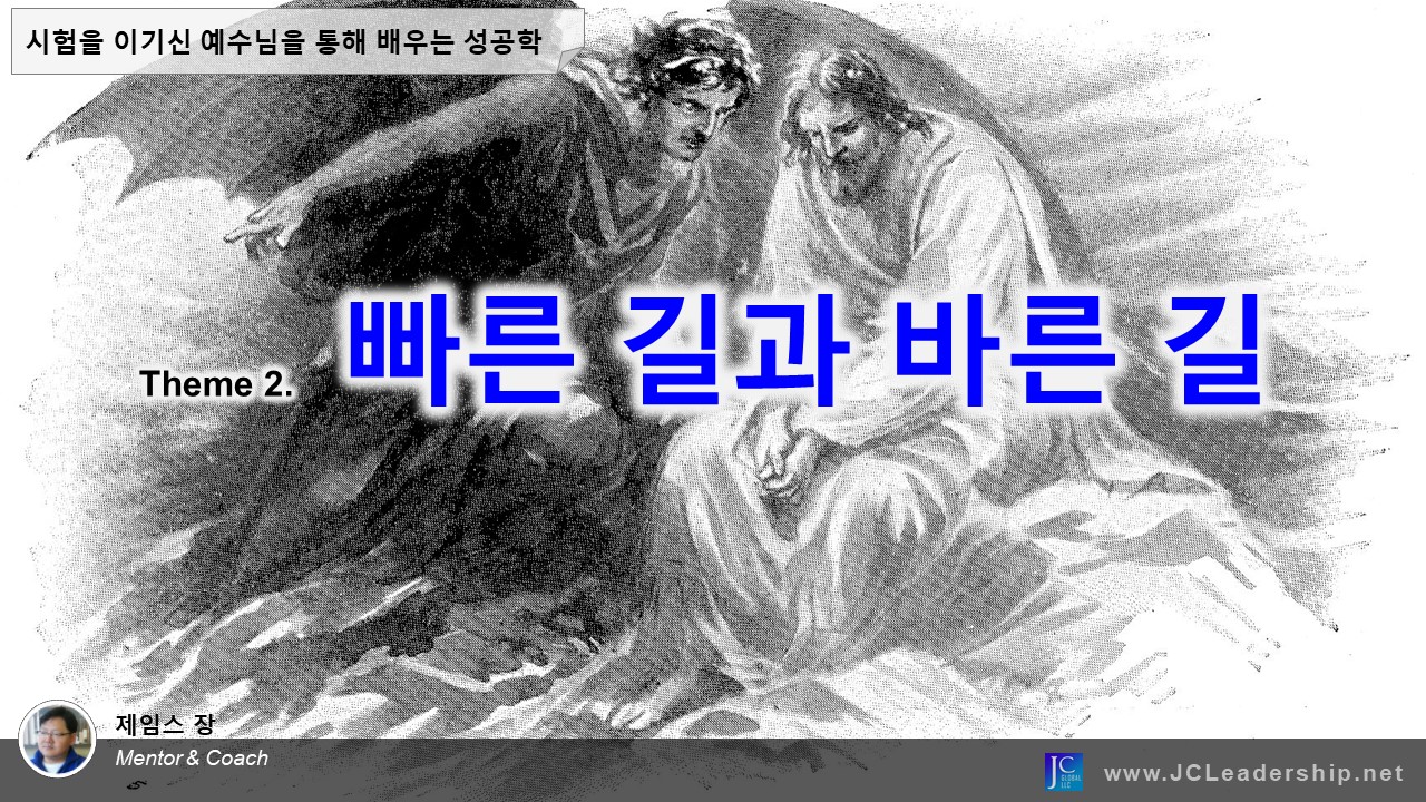 예수님의 공생애가 시작되기 전, 사역이 시작되기 전, 예수님께서 당하신 시험을 통해 성공의 비결을 봅니다. 예수님께서 받으신 세개의 시험 중 두번째는 바로 빠른 길과 바른 길에 대한 시험이었습니다. 예수님은 빠르고 쉬운 길이 아니라 바른 길을 선택하시며 살아가야 하는 리더로서의 분별력과 용기를 보여주셨습니다. 그렇게 훌륭한 리더로서의 모범을 보이시고, 주어진 일에 성공할 수 있는 핵심적 가치 기준을 보여주신 것입니다. 이것은 크리스천 리더 뿐만이 아니라 세상의 모든 리더에게 요구되는 덕목 중 하나인 것은 그리 논쟁의 여지가 없을 것입니다.