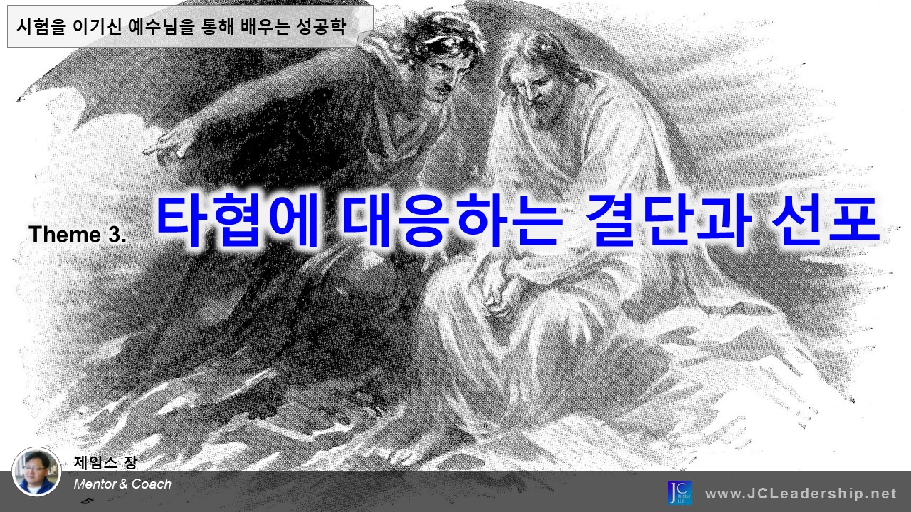 타협이라는 시험은 세상을 살아가는 크리스천 리더들에게도 수없이 다가오는 시험일 것입니다. 주일에 갑자기 만들어지는 부장님 또는 거래처와의 아침 골프 약속, 사업체를 매각하며 매출을 조금만 올려서 말하면 더 좋은 가격을 받을 수 있다는 중개인의 현명해 보이는 논리, 승진을 위한 업무 평가 기간 중 뇌물과 같은 물량 공세를 통한 (소위 말하는) 처세술, 나중에야 어떻게 되든 계약을 위해 책임질 수 없는 약속을 먼저 하고 마는 영업인의 자세 등과 같은 것들이 될 수 있을 것입니다. 이렇게 우리는 우리들의 삶속에서 눈 한번 질끈 감고 타협하면 원하는 것들을 소유하게 되는 그런 경우가 종종 있습니다. 그리고 우리는 이러한 타협을 처세술이다! 현실적이다! 등의 세상적 논리로 포장하기도 합니다.