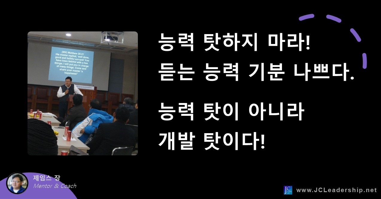 능력 없다 말하지 마십시오. 당신은 능력이 없는 것이 아니라 그저 개발이 좀 덜 된 것입니다. 그러니 두 번 다시 능력 탓하지 마십시오. 듣는 능력 기분 나쁠 겁니다. 개발 탓을 해야 합니다.