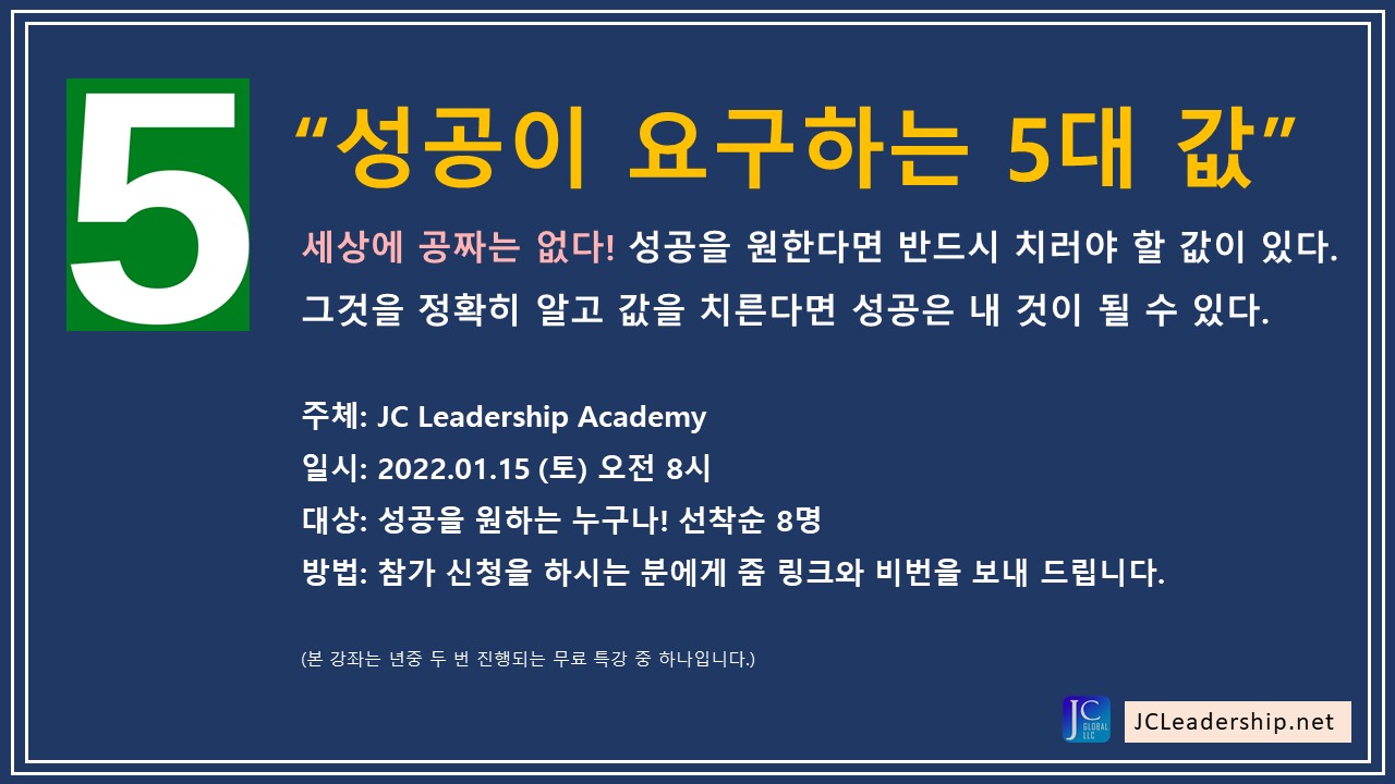 아시는 분들도 계시겠지만 제가 1년에 두번 재능기부(?) 차원에서 무료 특강을 진행합니다. 변화와 성장, 그리고 성공이라는 주제안에서의 내용으로 누구나 적용 가능한 내용으로 2022년의 그 첫 번째를 진행하려 합니다.