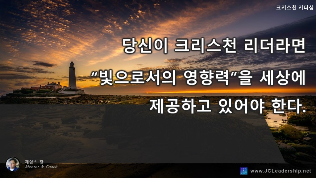 어쨌던 크리스천 리더는 “세상의 빛이라”는 사명 속에서 세상에 빛을 비추고 착한 행실을 보여주어 하나님께 영광이 되어야 하는 귀한 존재인 것이다. 이것이 세상이 이야기하는 리더의 기준, 책임, 목표 등과는 구별된 빛으로서의 영향력을 감당해야 하는 크리스천 리더의 존재감, 기능, 사명인 것이다.