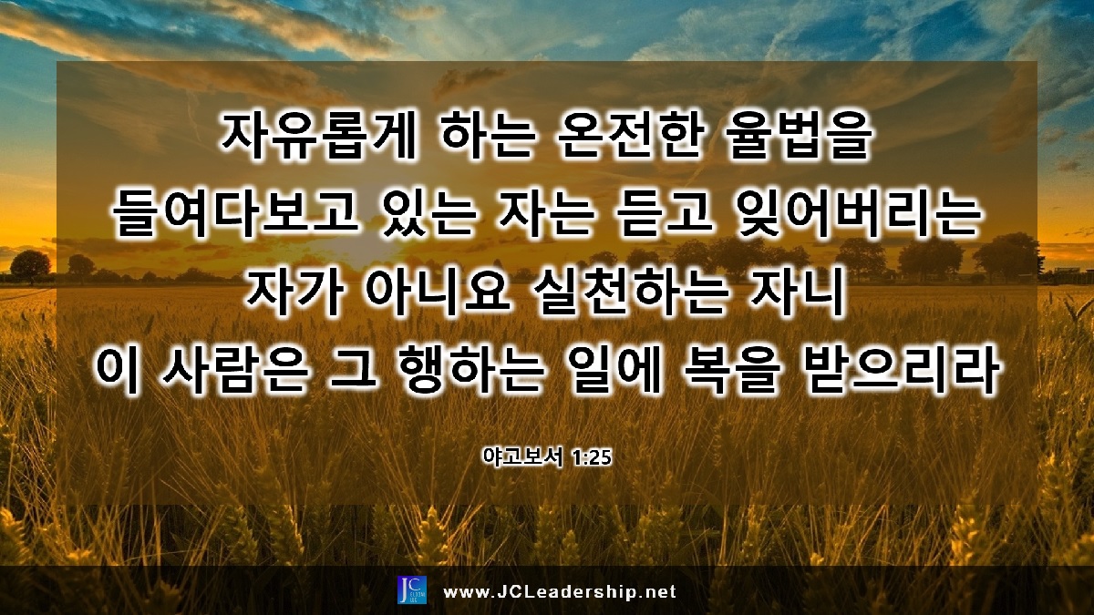 야고보서 1장 25절의 말씀은 그것을 알 수 있는 방법, 볼 수 있는 방법을 가르쳐 주십니다. 말씀을 듣고 공부하며 잊지 아니하고 실천하는 자가 되라며 우리가 행하는 일에 복이 주어지게 하는 방법을 가르쳐 주고 계신 것입니다. 그것은 바로 끈임없이 주 안에서 변화하고 성장하며 주님이 주시는 축복을 받을 만한 그릇이 되는 것입니다. 그렇다면 주님이 준비하신 축복, 약속하신 축복은 바로 준비되는 내 그릇의 크기, 바로 거기까지 인 것입니다. 축복을 받고 안받고의 문제는 주시는 주님의 문제가 아니라 바로 그 축복을 받는 나의 문제인 것을 깨닫습니다.