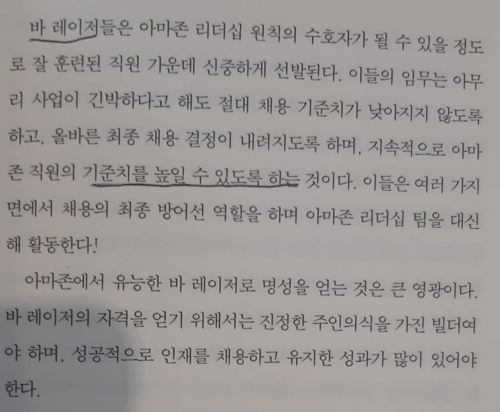 아마존에게서 배운다. 아마존에서는 그러한 기준을 높이는 사람을 “바 레이저”라고 한다. 특히 그들은 인사관련 부서의 “바 레이저”를 중요하게 생각한다. 아무래도 직원들의 질적 평균이 회사의 질적 수준과 비례한다는 비밀을 아는 기업가이기에 input의 평균을 높이는 것에 중점을 두고 있는 것이라 여겨진다. 직원은 비용의 대상이 아니라 투자의 대상이요 기업의 중요한 자산이라는 개념을 정확히 알고 있는 제프 베조스 회장이고 그것을 실천하는 기업가이며 그것을 앞장서서 실천하는 그이기에 가능한 듯하다.