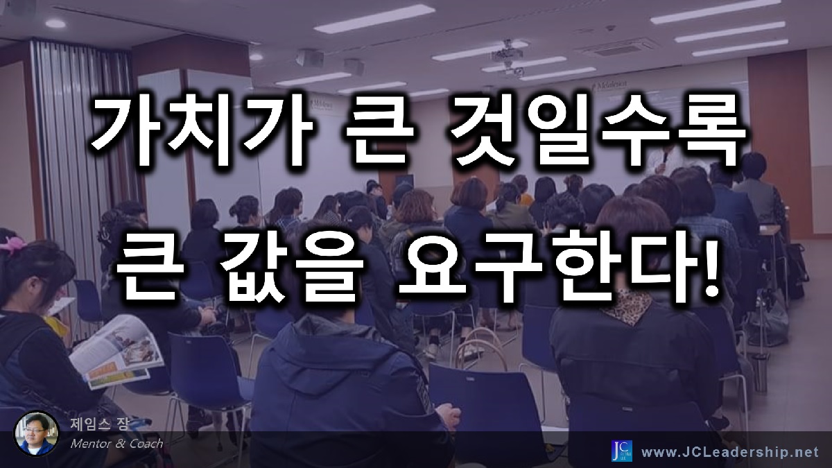 세상에 공짜는 당연히 없거니와 가치가 큰 것일수록 큰 값을 요구합니다.  국가와 민족의 자유와 평화는 그 값으로 목숨을 요구하고, 부모의 자리는 희생을 요구하고, 리더의 자리는 기여를 요구하고, TV를 켜려면 리모트 컨트롤을 누르거나 지니(인공지능 TV 언어 리시버)에게 명령을 해야 하는 것처럼 가치가 큰 것은 큰 값을, 작은 것은 작은 값을 요구합니다.  즉 모든 것에는 값이 매겨져 있고 그 값을 치루어야 내 것이 될 수 있다는 것입니다.