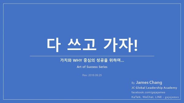 당신은 성공에 필요한 모든 자산을 가지고 있습니다. 다 쓰고 가십시오. 굳이 가진 자산들을 무덤까지 가져갈 이유는 없습니다. 꿈과 미래를 이루고가십시오. http://www.youtube.com/watch?v=g0DLsvSjJaM
