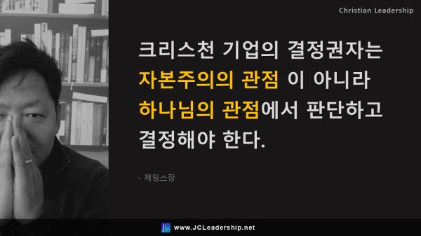 크리스천 기업에서 어떤 결정을 해야 하는 위치에 있는 리더라면 반드시 질문해 보아야 한다. 자신의 판단과 결정이 자신의 인생뿐만이 아니라 기업과 조직에 속한 하나님이 사랑하는 하나님의 다른 자녀들의 삶에도 영향을 끼치기 때문이다. 사업체, 조직, 가정 등의 맡기신 모든 것의 구성원들을 향한 하나님의 사랑과 쓰임이 분명 있기 때문이다.